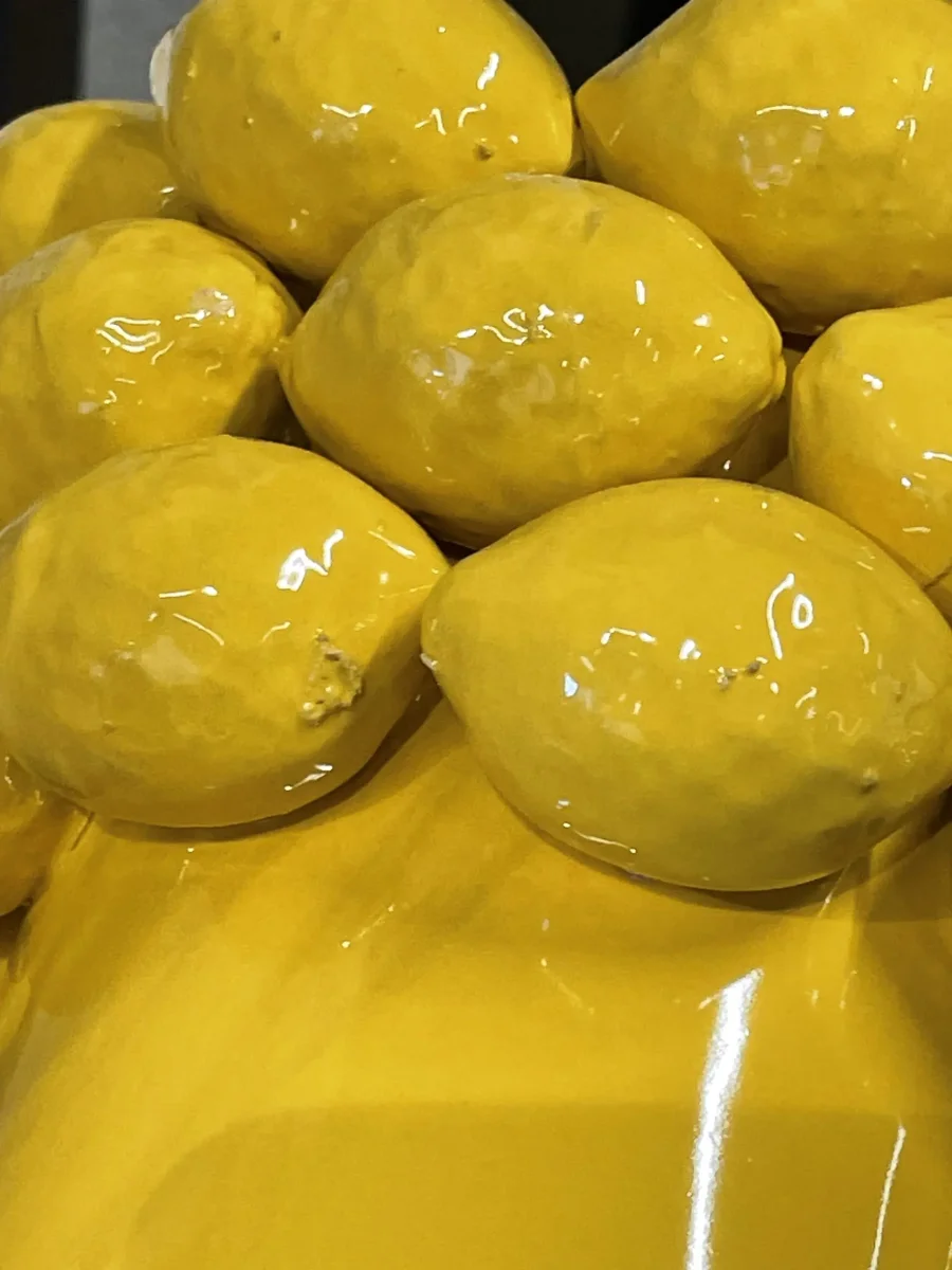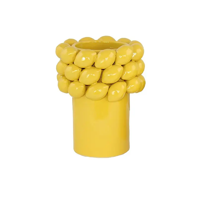 En vas som pryds av solgula citroner från Masthave. Den fungerar både som vas och kruka och sätter den där extra färgklicken i hemmet med sin klara gula färg. Designen sticker ut från andra krukor och vaser och står absolut i centrum vare sig den står på bordet, bänken eller fönsterbrädan. Den bidrar till samtalsämnen, sätter ett leende på läpparna och i den kan du plantera din favoritblomma eller sätta ner en vacker bukett. Produkten har skönhetsfel i form av defekter i glasyren. Se bilder. Denna vasen finns i annan design och andra storlekar. Material: Glaserad stengods Storlek: 18×23 cm Läs mer…