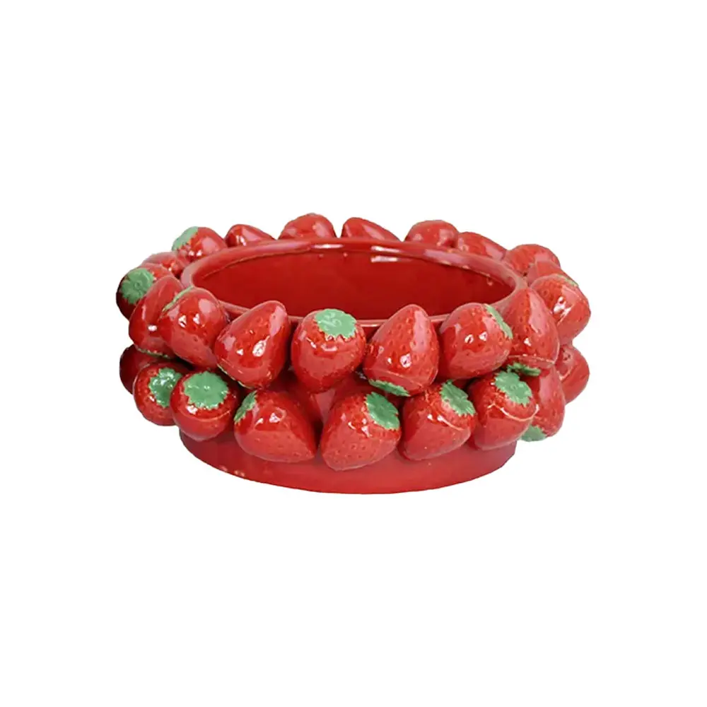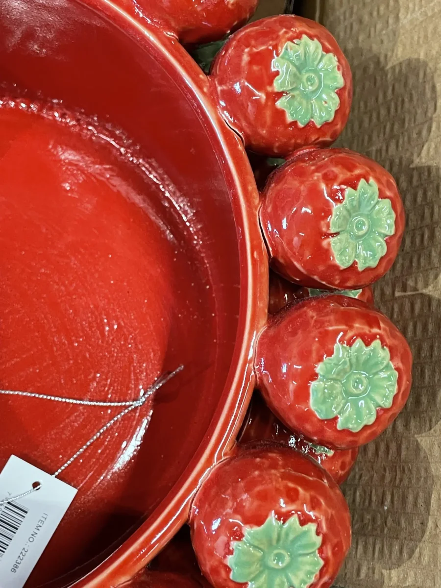 En skål som pryds av röda jordgubbar från Masthave. Denna skålen är perfekt för att sätta den där extra färgklicken i hemmet med sin vackra röda färg. Designen sticker ut från andra skålar och står absolut i centrum vare sig den står på bordet, bänken eller skänken. Den bidrar till samtalsämnen, sätter ett leende på läpparna och i den kan du lägga färska frukter, nötter eller annat smått och gott. Produkten har skönhetsfel som består av defekter i glasyren. Se bilder. Material: Glaserad stengods Storlek: 27×11 cm Läs mer om Masthave nedan…