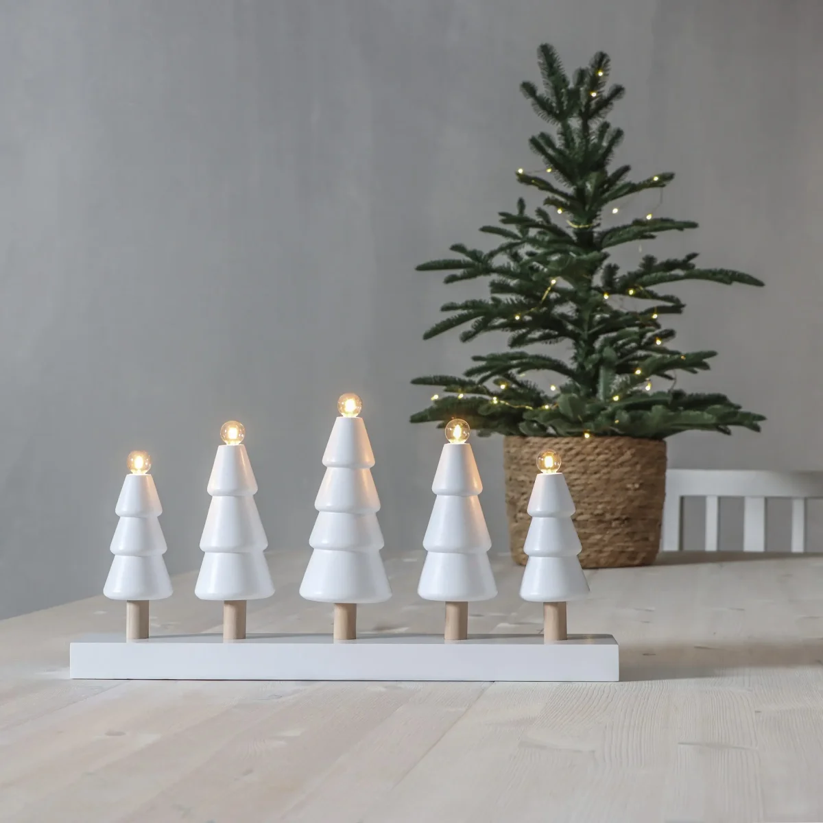 Adventsljusstake med ett stilrent granskogsmotiv, tillverkad i trä. De vita granarna med naturliga stammar ger en vacker och lugn känsla. Ljusstaken sprider en varm och mysig julstämning, perfekt för att skapa en inbjudande atmosfär. Placera den i fönstret, på en hylla eller på en skänk för att lyfta juldekoren. En favorit som kan stå framme hela vintern för en långvarig julkänsla. FSC®-märkt för ett hållbart val. Färg: Vit Anslutningskabelns färg: Vit Ljusfärg: Klar Bredd/längd: (cm)46,00 Höjd: (cm)24,00 Djup: (cm)8,00 Användningsområde: Inomhus Ljuskällor: 5 Ljuskälla ingår: Ja Sockel: E10 Strömbrytare: Ja Total effekt: (W)18,00 Ljuskällans Strömstyrka: (mA)55 Ljuskällans Effekt: (W)3 Ljuskällans…