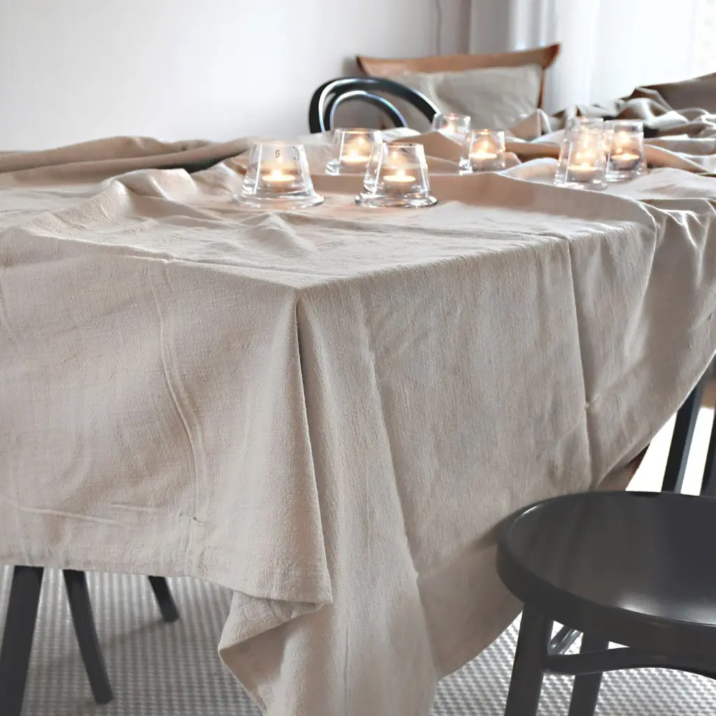 Duk i återvunnen bomull. Middagsbjudning, vardag eller fest, som att måla en tavla lägger man ut en duk och börjar fylla den med glas bestick och dekoration. Den enfärgade duken Almo i högkvalitativ bomull, gör att din dukning får en lyxig och stilfull känsla.