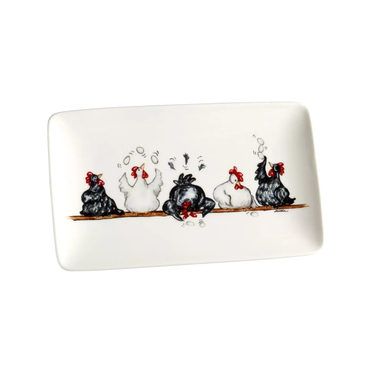 Assiett eller serveringsfat med tryckt motiv på tokiga hönor. Motivet är handritat av designern Camilla Ståhl. En perfekt present att ge bort eller till sig själv! Assietten är tillverkad i porslin och tål diskmaskin och mikrovågsugn Psst… Denna serien finns även som mugg, skål, äggkopp & servett Mått: L.21cm, B.12,5cm Material: Porslin Läs gärna mer om Nääsgränsgården nedan