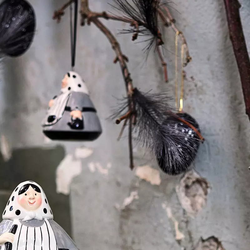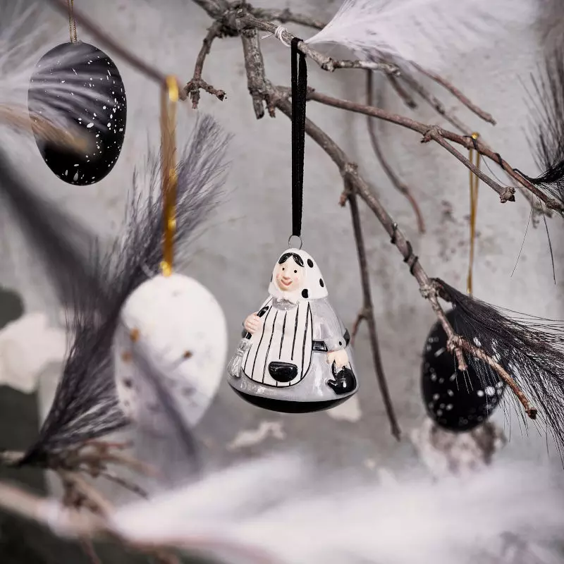 Gullig dekoration till påskriset i form av tre påskkärringar påväg till blåkulla! Påskkärringarna hängs i ett svart snöre och har gråa klänningar med ett vit/svart randigt förkläde. Säljs i 3-pack. Storlek: 6×7 cm Material: Porslin Skötselråd: Torkas av med fuktig trasa Läs gärna mer om CULT Design Sweden och deras kollektion här nedan.