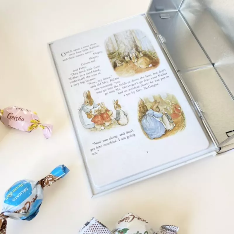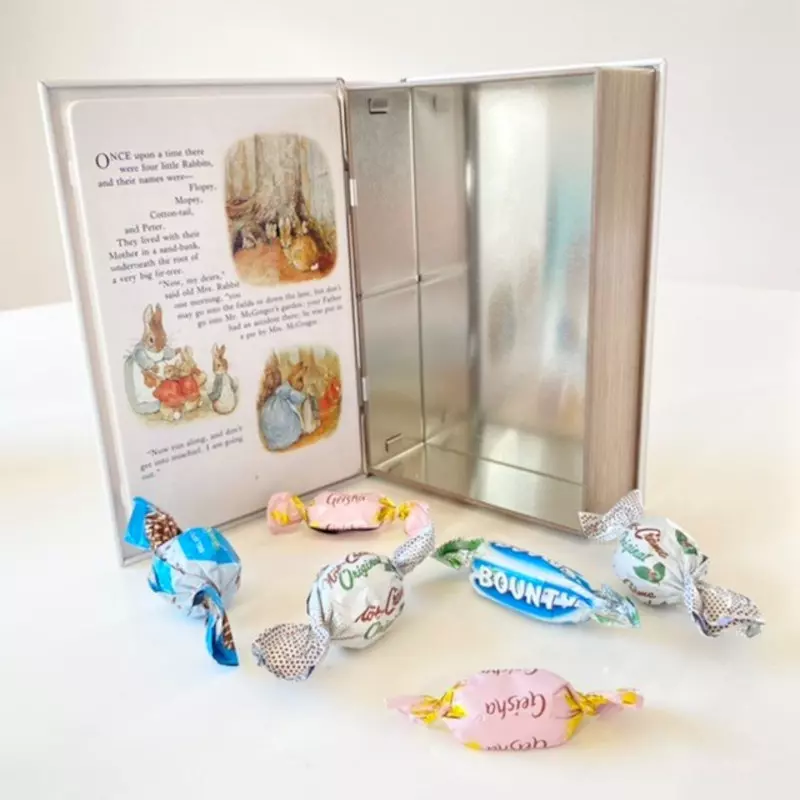 En ortoligt fin plåtburk desigand av Elitetins, i form av en bok med en söt kanin på som är ritad av Beatrix Potter.Bokburken kan fyllas med det mesta, som godis, kakor eller små pryttlar. Bokburken kan också ställas i en bokhylla bland andra böcker, vipps så blir det din alldeles egna lilla gömma. Mått: B*14,7 – H*18 – D*4,7 cm Skötselråd: Skölj ur och torka därefter med trasa