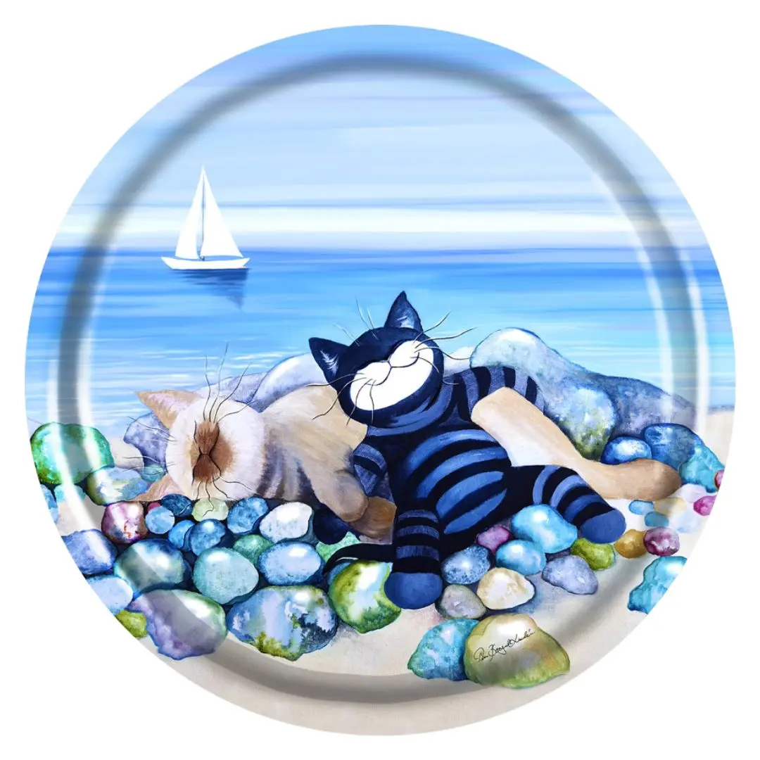Den runda brickan med strandsatta katter på, en förtrollande och lekfull detalj för ditt hem! Med ett charmigt motiv av katter som strandsatta på en stenstrand, fångar denna bricka en avkopplande och somrig atmosfär. Designad av Pia Bergvall Lundén, ger den en glad och livfull känsla som passar perfekt för servering av snacks, frukost eller fika.