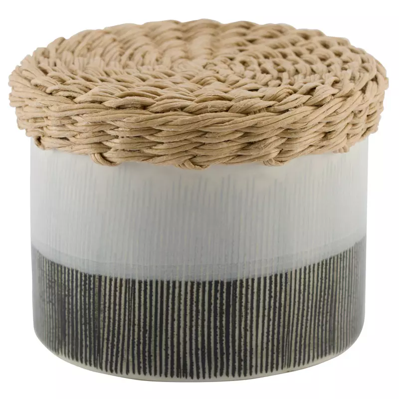 Trendig burk i handmålat stengods och lock i naturfärgat bastliknande material. I serien Ashi finner ni även vaser, fotoramar, krukor och ljuslyktor. Med sin dova färgskala skapar produkterna en behaglig atmosfär i hemmet, antingen i sin egen elegans eller i kombination med varandra. Material: Stengods Storlek: Ø 10 x 8 cm Skötselråd: Torkas av med en torr trasa. Läs gärna mer om Ashi-kollektionen här nedan.