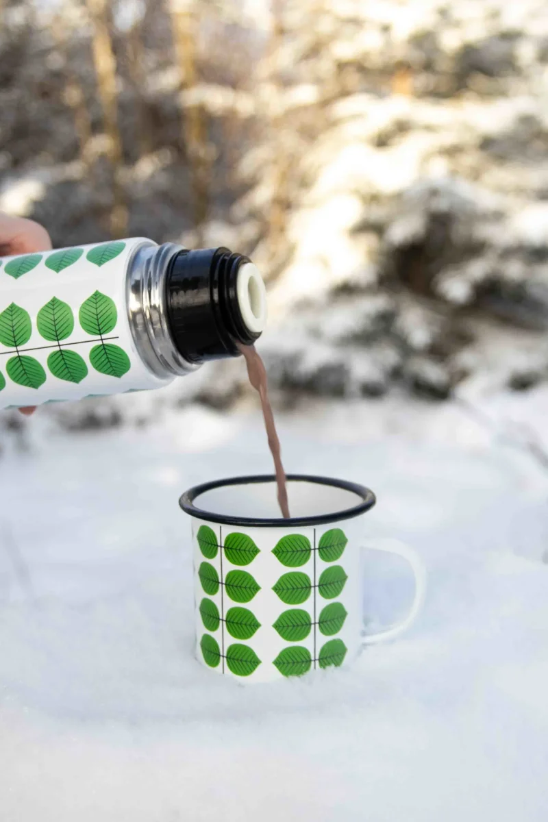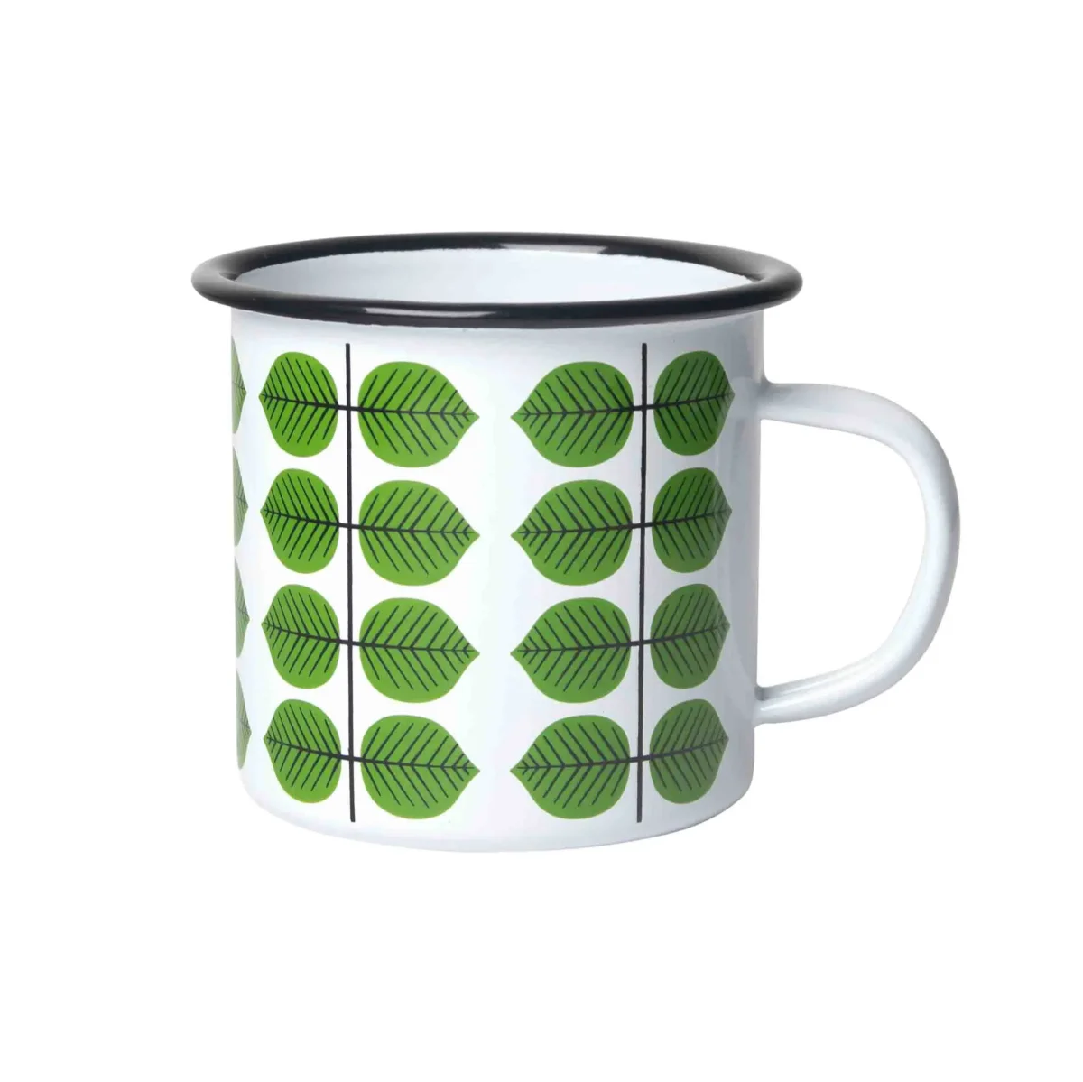 En mugg i emalj med Stig Lindbergs mönster Berså. Denna mugg är perfekt att ha med sig på picknicken och utflykter!