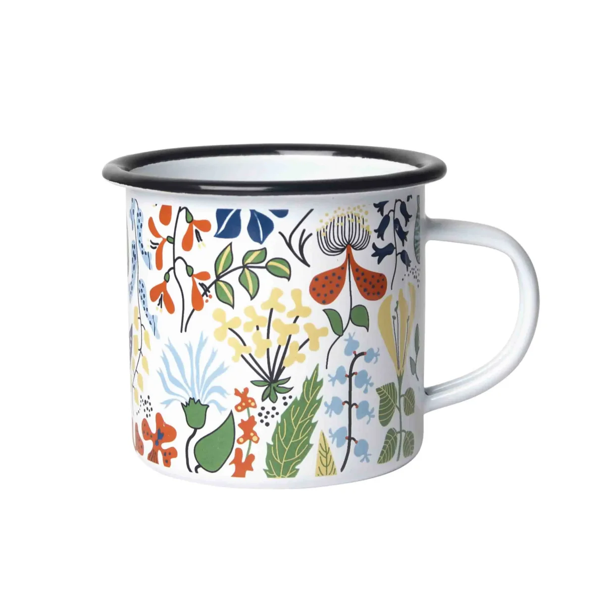 En handmålad mugg i emalj med Stig Lindbergs mönster Herbarium. Denna mugg är perfekt att ha med sig på picknicken och utflykter!