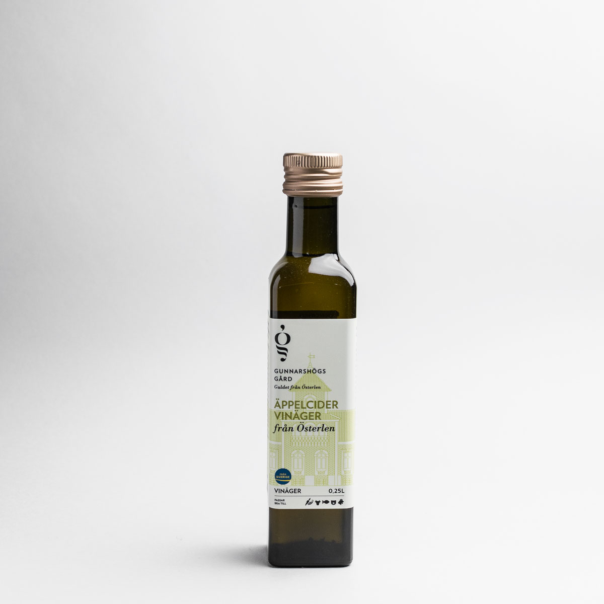 Gunnarshögs Gårds äppelcidervinäger är tillverkad av must från skånska äpplen som får jäsa till cider och sedan bli vinäger. Det ger en rund och fin äppelcidervinäger med tydlig karaktär av äpple. Vinägern är god i marinader eller till en fräsch bönsallad med haricot verts, lök, fetaost och en vinägrett på citronolja och äppelcidervinäger. Syrahalt 5%.