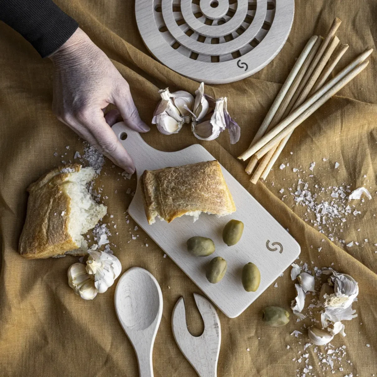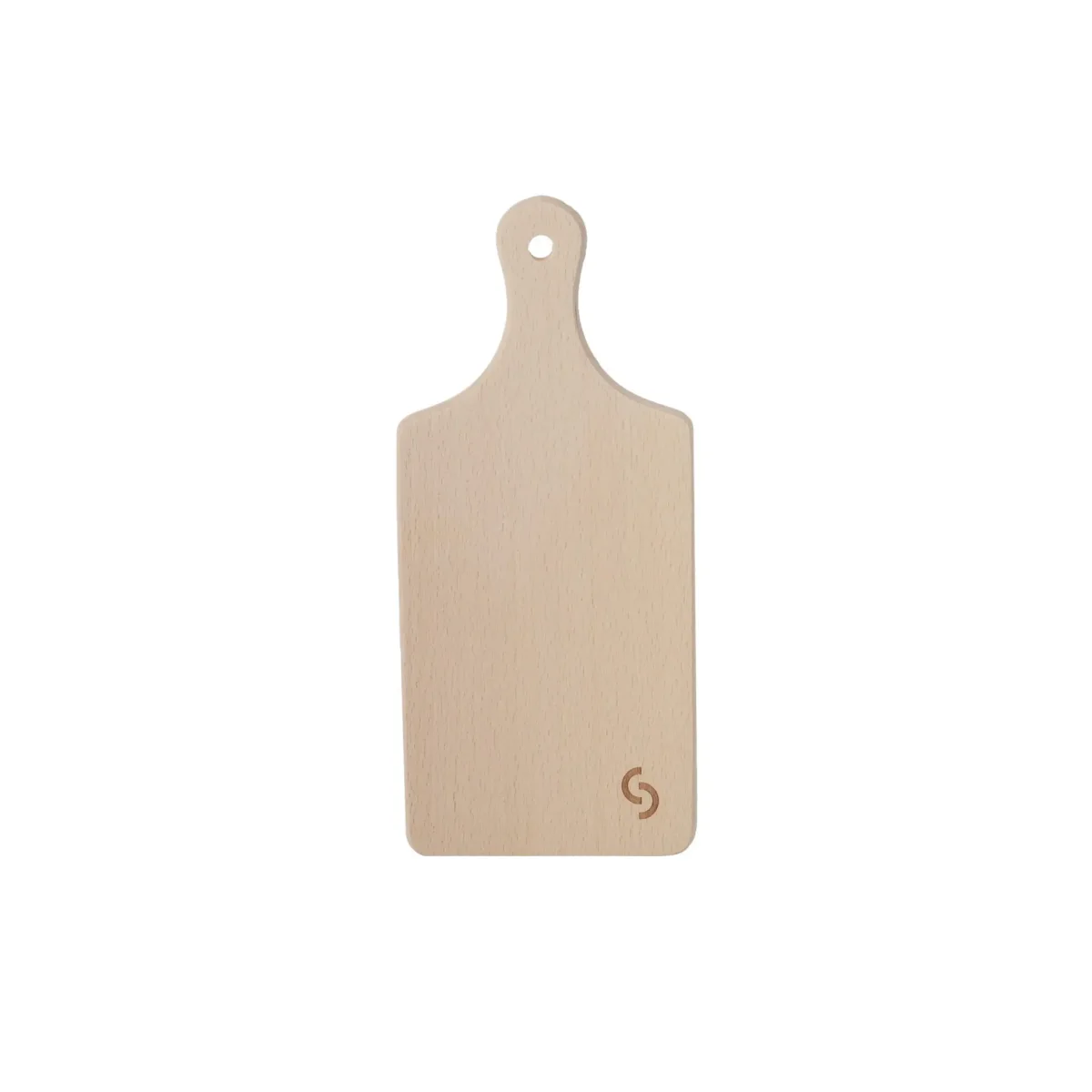 En stadig och smidig skärbräda som är tillverkad av massivt trä. Utmärkt för både servering och skärning av mindre matvaror. Skärbrädan har ett praktiskt handtag som gör den enkel att hantera och ger dig möjligheten att hänga den upp med ett vackert band på en knopplist när den inte används. Detta gör den både funktionell och dekorativ i ditt kök eller matplats. Skärbrädan är ett mångsidigt och stilfullt tillägg till din köksutrustning som kombinerar användbarhet med visuell skönhet.