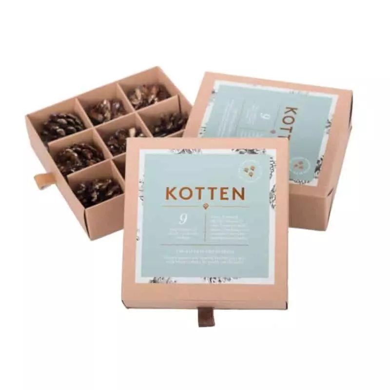 Kotten är den perfekta gå-bort-present till värden eller värdinnan som redan fått vinflaskan, konfektlådan och blomsterkvasten. Kotten är 9 hållbara mysstunder. En present med omtanke om både mottagaren och moder jord. Den består av två kombinerade restprodukter, en innovativ idé – snyggt förpackat för att tålas att stå framme på spiselkransen. Med en enda Kotte, en tändsticka och några torra vedklampar tänder du brasan på några minuter utan näver, papper eller kemikalier – eller grillen helt utan tändvätska.