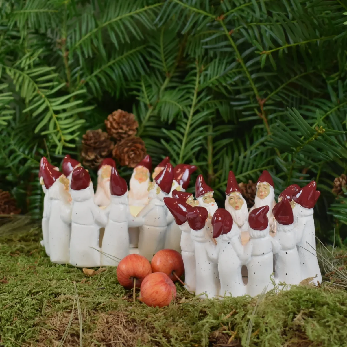 Lys upp vintermörkret med denna ljuslyktan med tomtar som är klädda i klassiska, vita, tomtedräkter, röda luvor och håller varandra i händerna som bildar en cirkel. Inuti cirkeln finns en ljushållare där du kan placera ett värmeljus. Tomtarna har alla olika ansiktsuttryck vilket gör varje tomte unik. Mått: 9*9*6,5 cm Läs gärna mer om Harvesttime nedan…