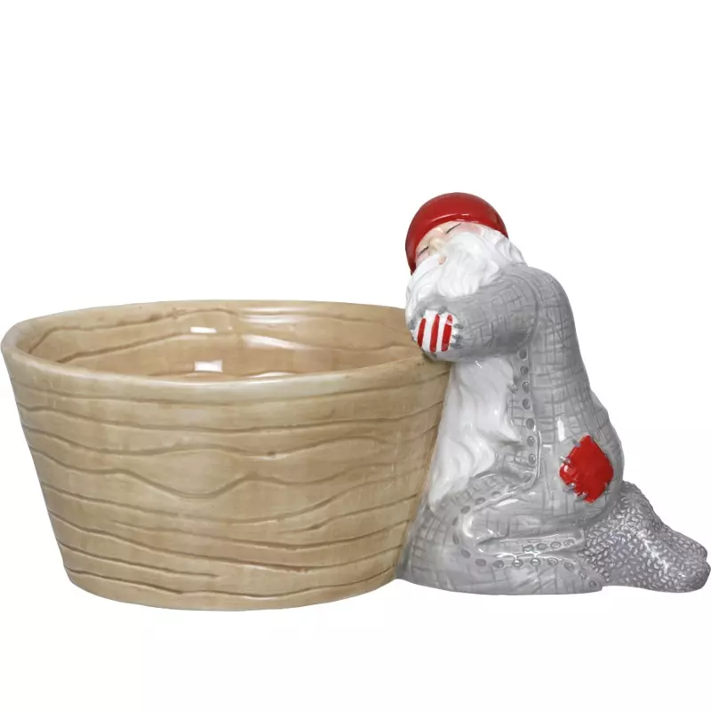 Marita Lord´s fantasi blev tomtarna sömniga, vintern är ju så kall och mörk. De har hemmastickade raggsockar, de sopsorterar, de lappar och lagar sina nattskjortor, de tänker hållbart. Serien görs i lergods och duktiga kvinnor målar keramiken för hand.