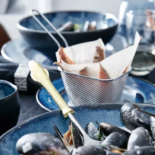 Salladsskål ifrån märket By On – On interiör. Denna fina serie har en härlig blå botten som är inspirerad av havets alla kulörer och olikheter. På utsidan är alla delar av kollektionen mattsvarta och har en väldigt stilren design. Denna servis gör sig bra när du har sällskap och bjudningar. Alla delar gör sig bäst ihop och skapar en havs-atmosfär där det passar ypperligt att servera allt vad havet har att erbjuda.