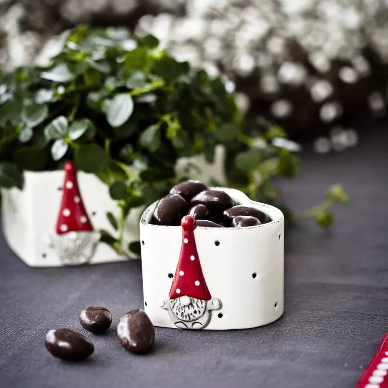 Under juletider är det A och O med mat och godis och ännu mer stämningsfullt blir det av att ha fina skålar att duka fram i. Tomten hugos skålar passar bra till de små godsakerna, glöggtillbehören eller exempelvis sillen eller hovmästarsåsen. Oavsett vad man väljer att ha i så passar de såväl solo på bordet som tillsammans i grupp. Oerhört fina och välpassande till jul och advent. Med tomten Hugos matchande duk är exponeringen verkligen på topp! Storlek: ø 7cm Material: Porslin Sköteselråd: Handdiskas Läs gärna mer om tomtar här nedan.