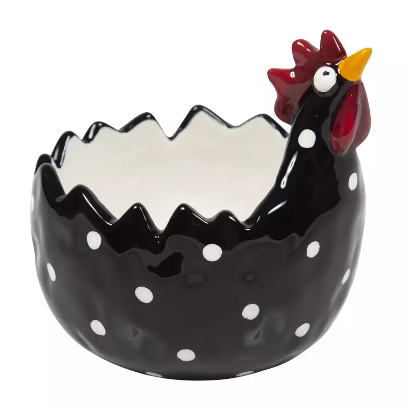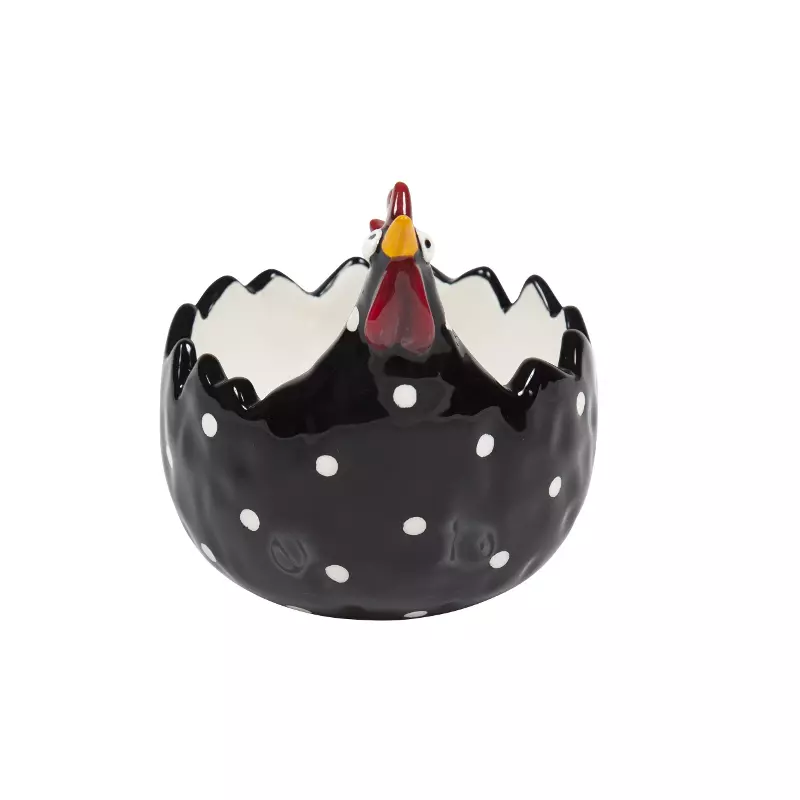 Pynta hemmet med denna fina höna från Nääsgränsgården! Handmålad svart skål med prickig design och oregelbundna kanter vilket ger en fin hantverkskänsla och liknar ett brutet äggskal. Perfekt att servera påskgodiset i! Mått: 11 cm hög Volym: 35 cl Färg: Svart/Vit Läs gärna mer om Nääsgränsgården nedan