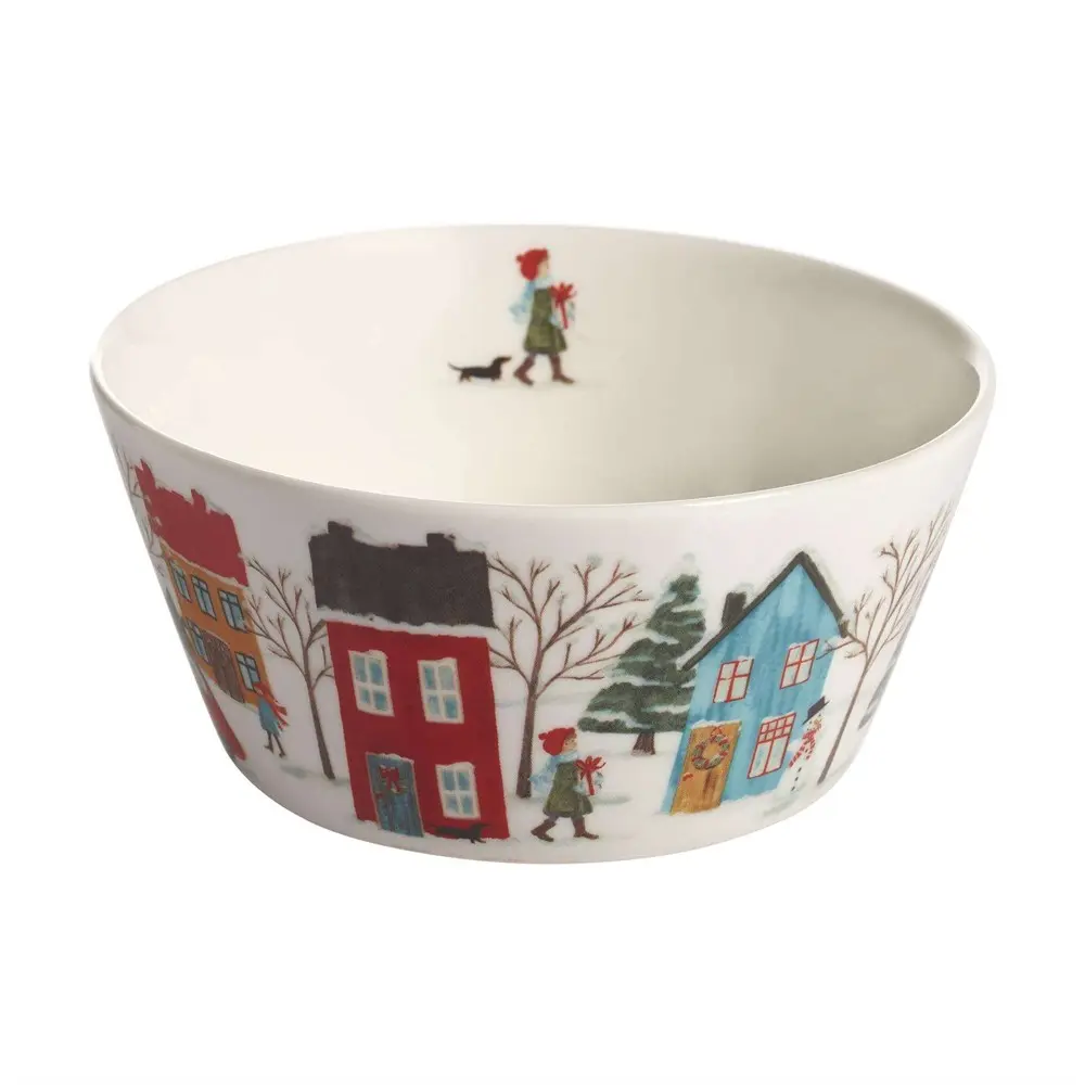 Skål med tryckt motiv av vinter. Skålen gör vintern extra mysig med motiv av ett torg med hus, julgranar, djur och människor som rör sig. Motivet är handritat av designern Camilla Ståhl. En perfekt present eller till dig själv! Skålen är tillverkad i porslin och tål diskmaskin och mikrovågsugn. Psst… Denna serien finns även som mugg & assiett. Mått: H.6,5, 50 cl Material: Porslin Läs gärna mer om Nääsgränsgården nedan