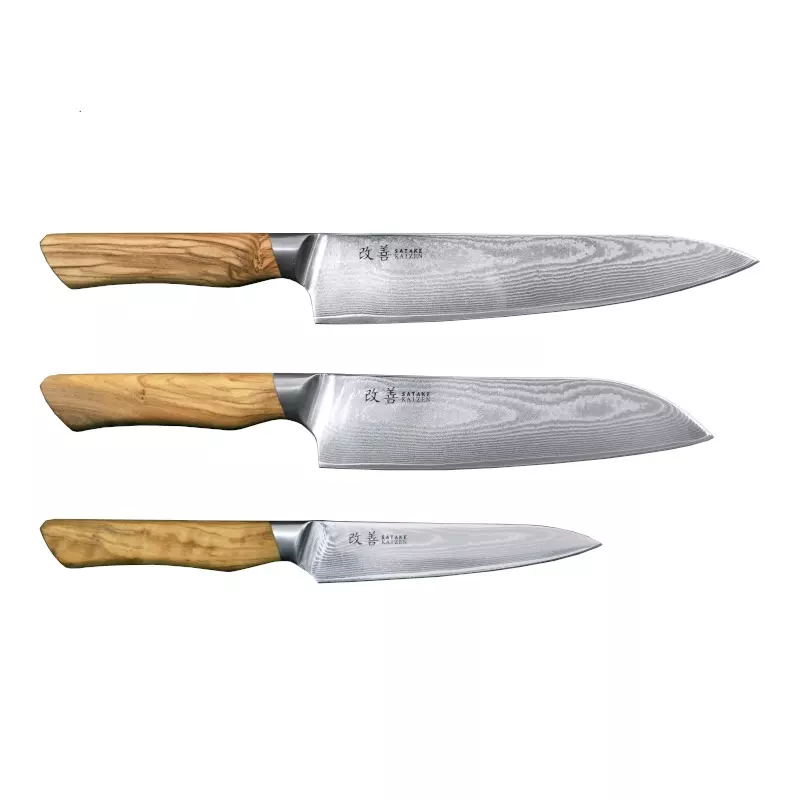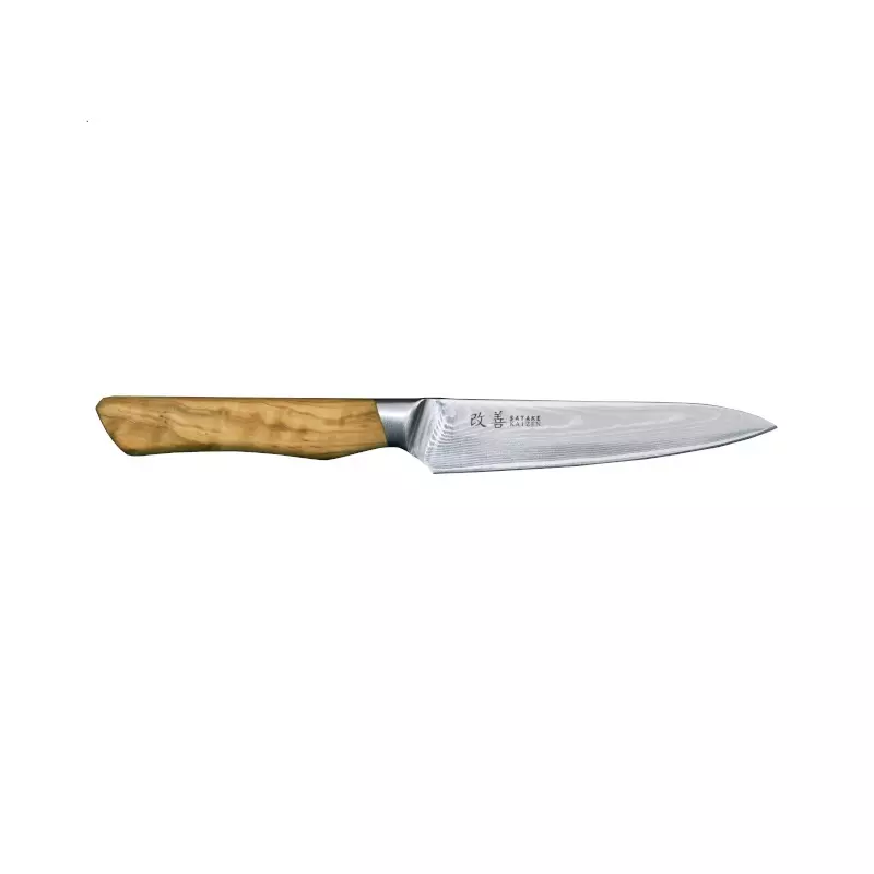 Satake Kaizen är en premiumserie från knivarnas huvudstad Seki City, Japan. Knivarna har ett skaft av oregelbundet ådrat olivträ och ett tunt och elegant 67-lagers damascusblad, 66 lager supportstål och en kärna av ytterst kvalitativt MVS10Cob-stål. Ordet Kaizen står för den ständiga strävan mot förbättring och denna nyhet i Satakes sortiment är en serie knivar av absolut högsta klass.