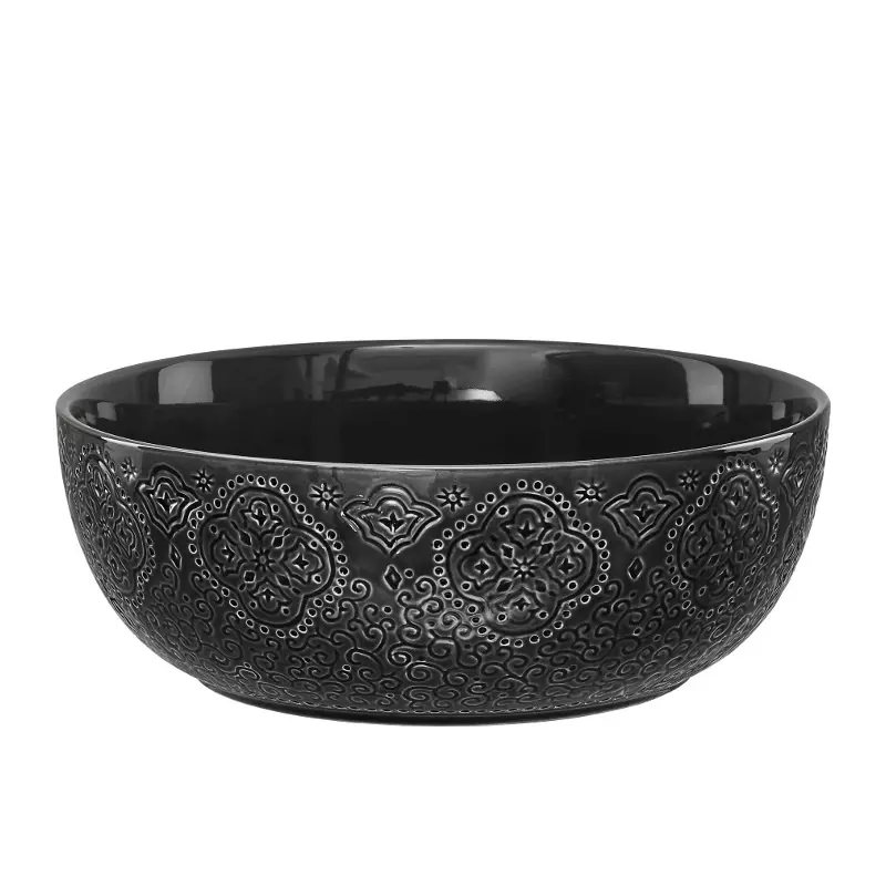 Skålrik – en kombination av skål och djup talrik. En vackert och praktiskt Skål för frukt, eller fredagens snax. En skål som har en mängd användningsområden. Varför inte lite grönsaksstavar med lite dip? Endast fantasin sätter gränser. Mönstret är gjort för hand och det syns att det är ett riktigt hantverk. Tekniken gör att glasyren kan skifta en aning i färgton och form mellan olika produkter. Material: Stengods Skötselråd: Tål diskmaskin, mikro & ugn Färg: Asfalt Mått: Höjd 7,5 Diameter 21 cm Volym: 1,7 Liter Läs gärna mer om Orientkollektionen här nedan.
