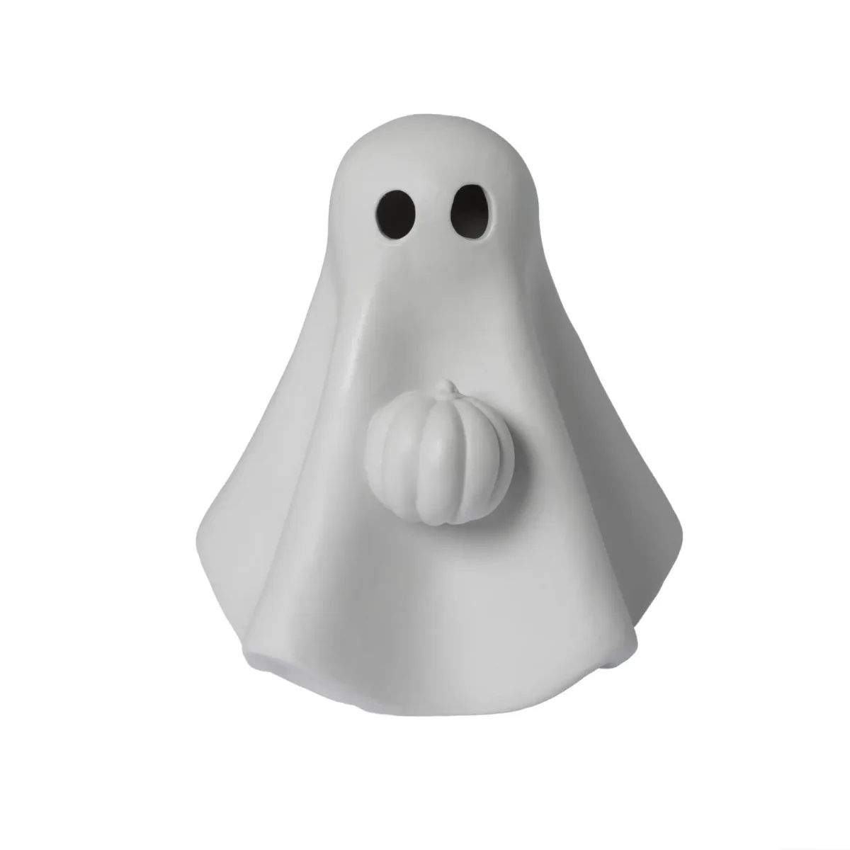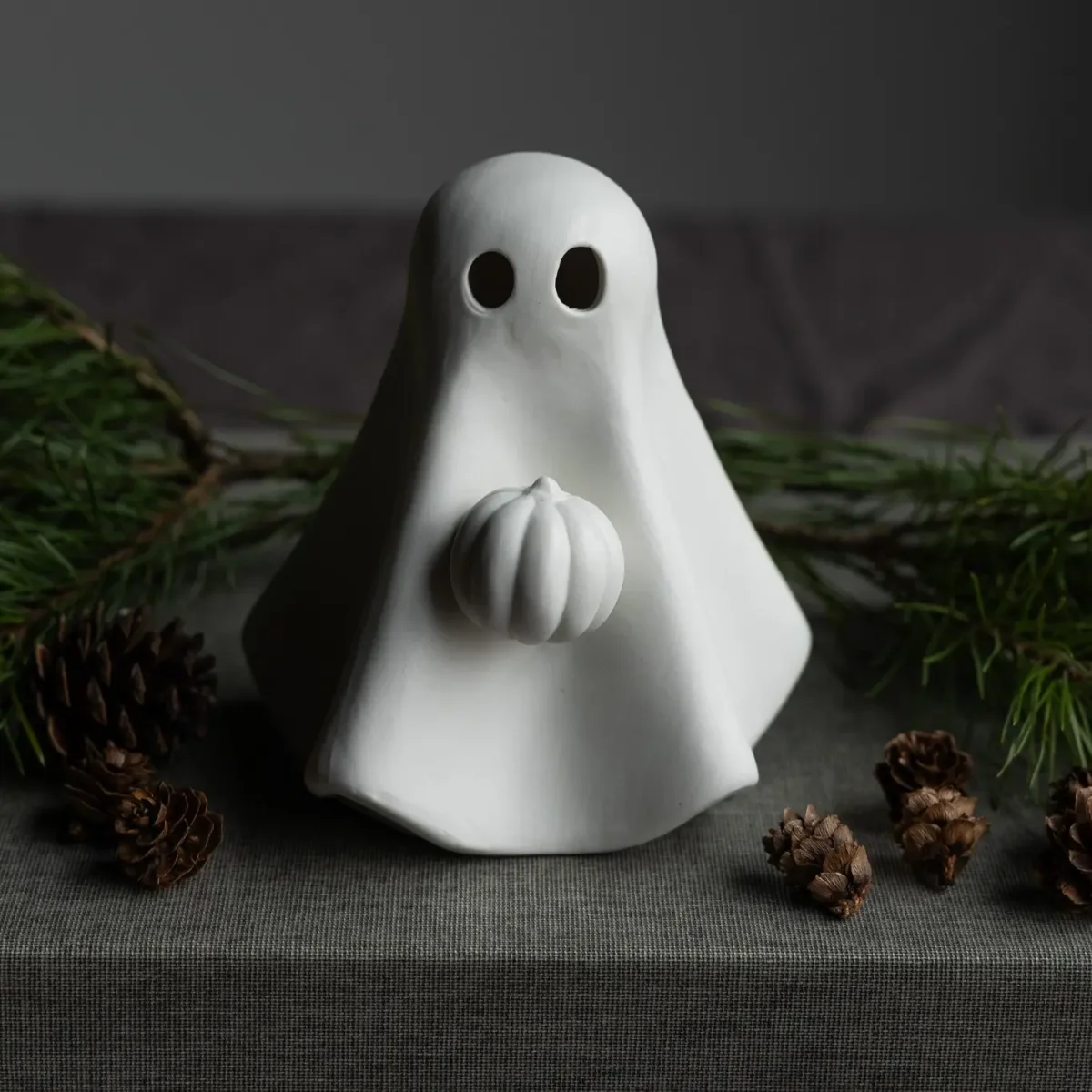 Lekfull höstdekoration i matt keramik. Detta charmiga lilla spöke med en pumpa är en perfekt prydnad för bokhyllan, fönsterbrädan eller barnrummet. Det är också viktigt att notera att små prickar eller gropar kan förekomma i keramiken, då varje produkt är handgjord och unik.