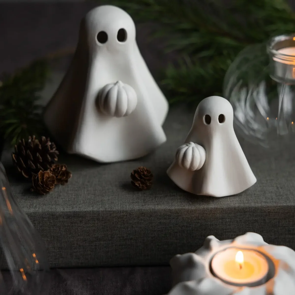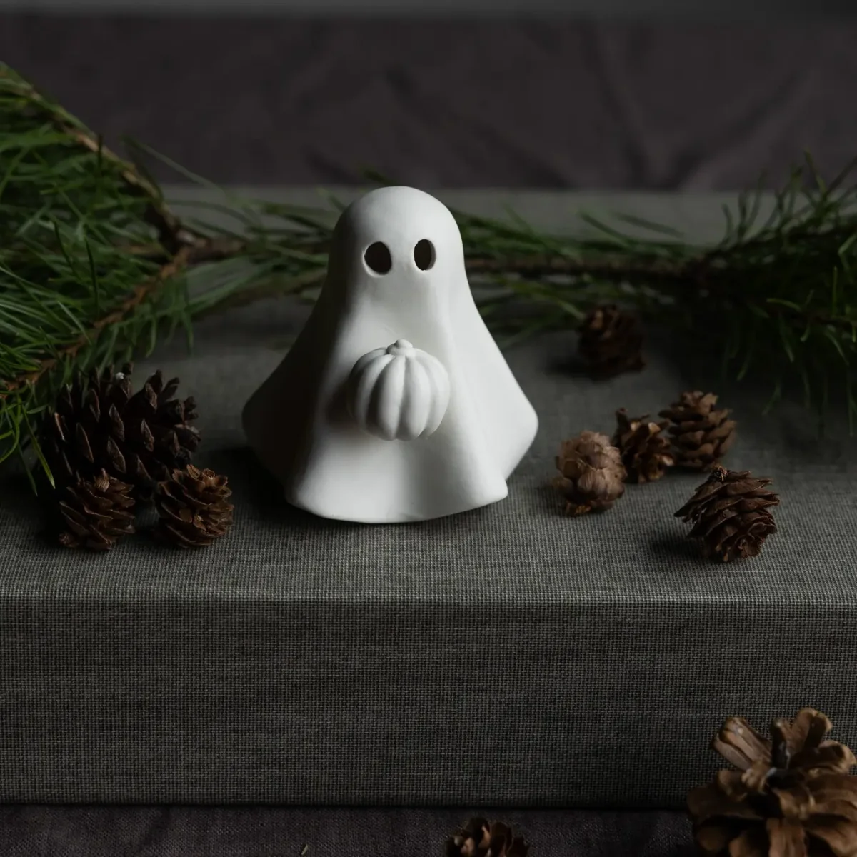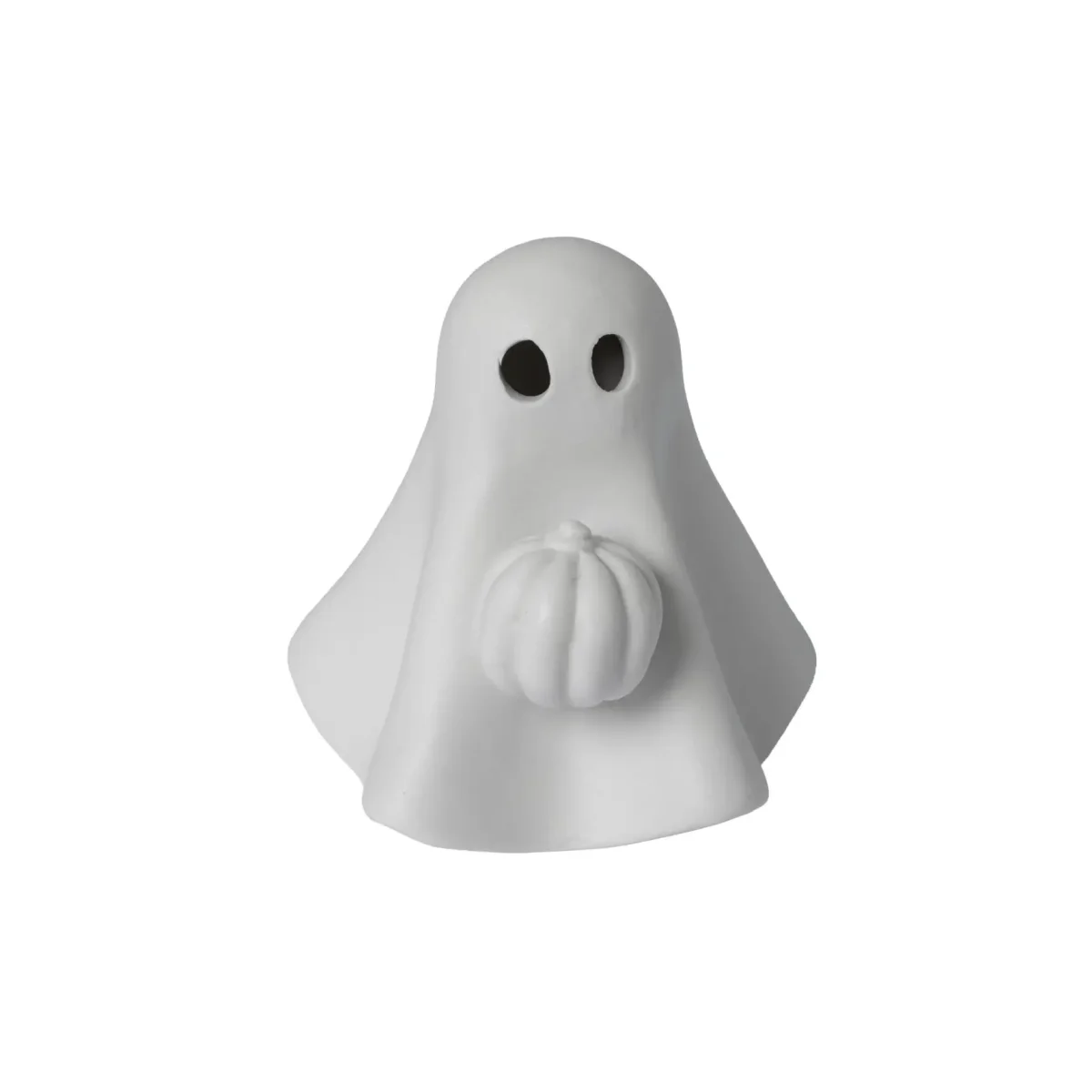 Lekfull höstdekoration i matt keramik. Detta charmiga lilla spöke med en pumpa är en perfekt prydnad för bokhyllan, fönsterbrädan eller barnrummet. Det är också viktigt att notera att små prickar eller gropar kan förekomma i keramiken, då varje produkt är handgjord och unik.