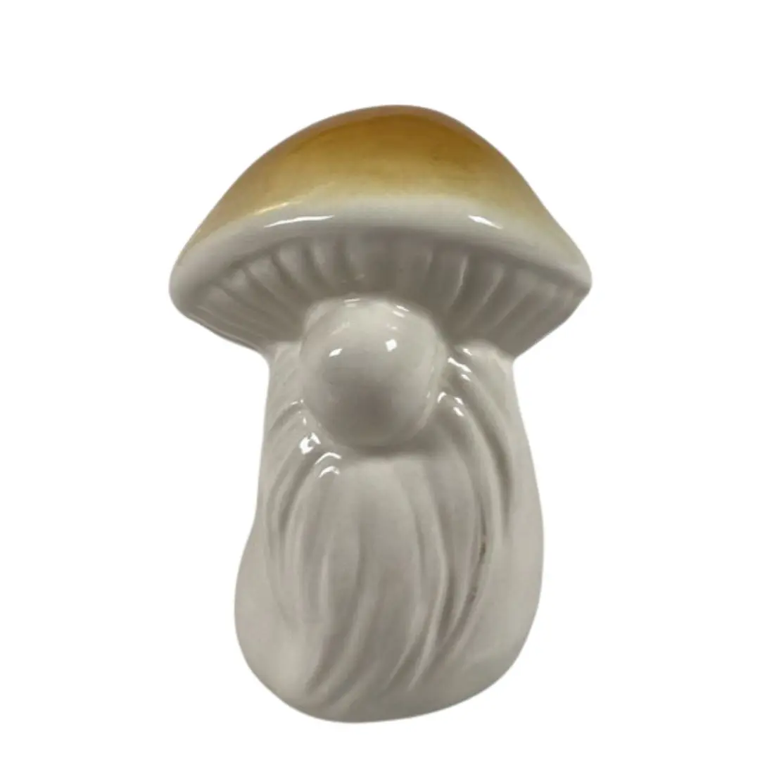 Denna charmiga svamptomte med sitt skägg som smälter samman med den mjuka svamphatten i varma, jordnära toner, blir den ett dekorativt inslag som passar både året runt och som en del av din juldekoration. Perfekt att placera på hyllan, bordet eller i ett stilleben för att sprida en mysig och hemtrevlig känsla. Finns i två storlekar.. Mått: 11,3 cm Material: Porslin Färg: Vit & gul