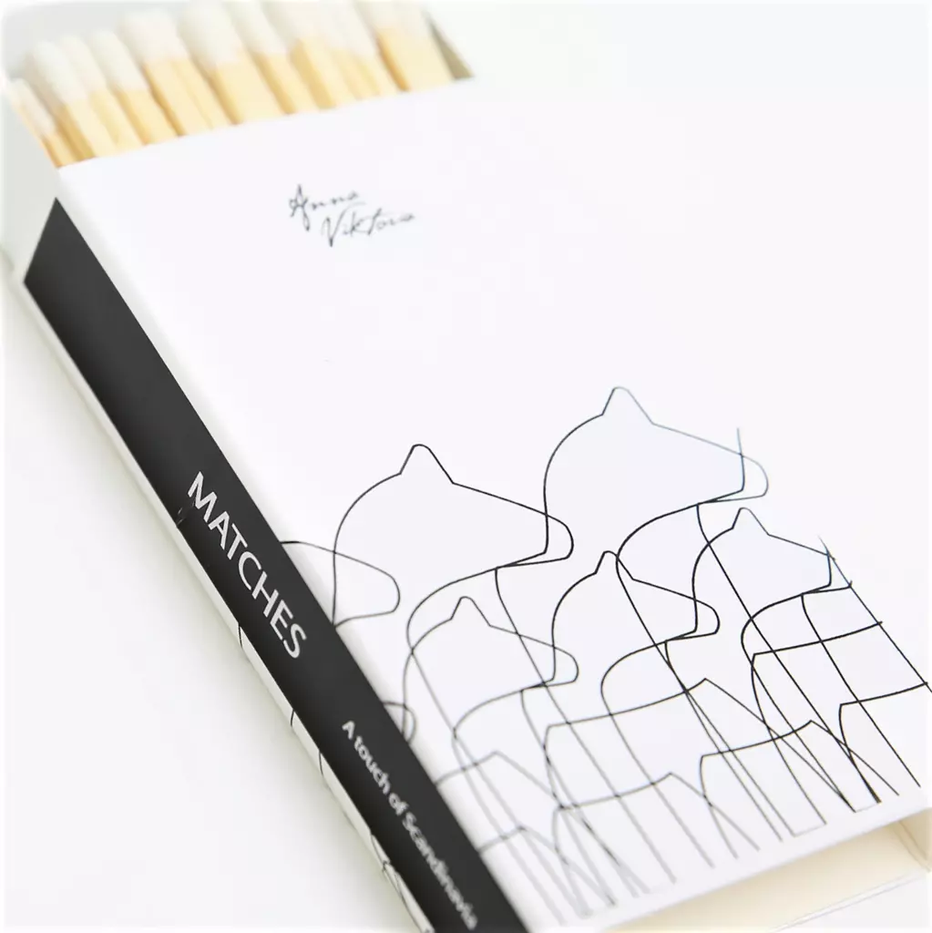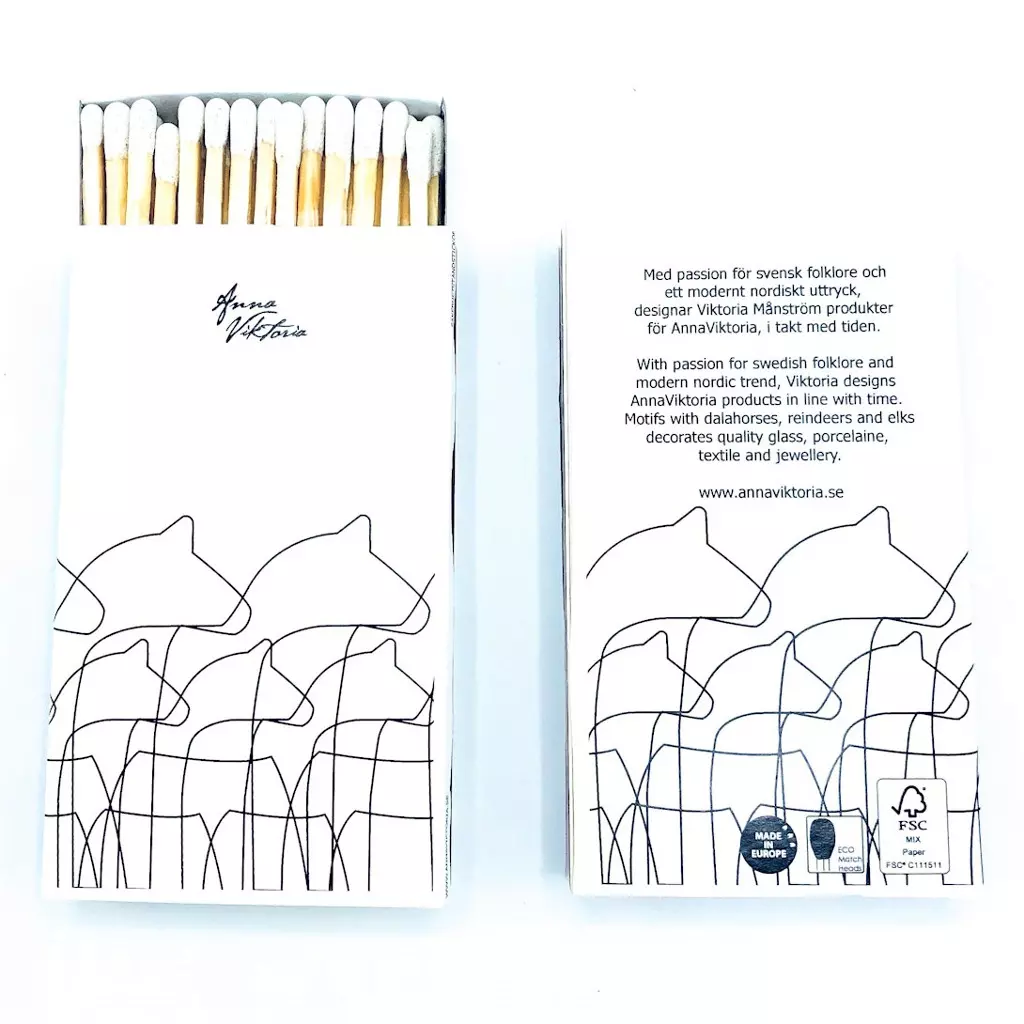 Långa och eleganta tändstickor i en lite mer exklusiv ask med AnnaViktorias vackra dalahästar på. Ger en lite lyxigare känsla när du tänder ljusen i din ljusstake. AnnaViktorias produkter sträcker sig från filtar till diskhanddukar, och allt däremellan. Inspirationen hämtas från våra vackra nordiska renar och leker med siluetter, färg och form. Det är bara att mixa och matcha, det kan inte bli fel.