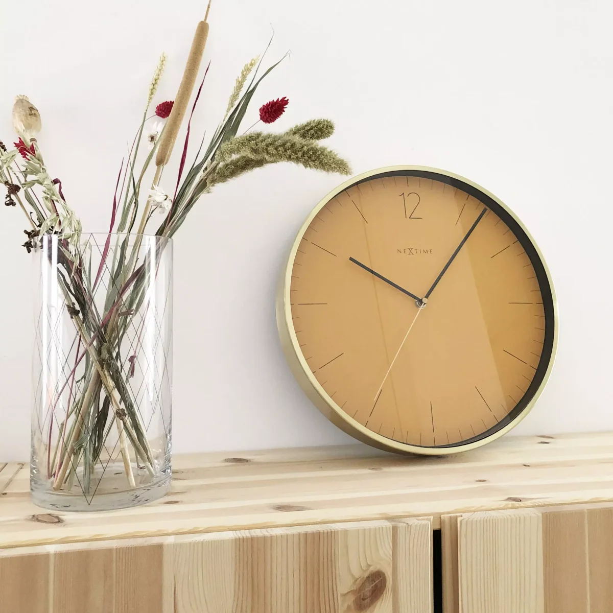 För dig som vill ha in lite färg i hemmet är denna klockan perfekt. Denna mörka, gula färgen, höstens färg, gör sig synlig på väggen och lockar gärna blickar till sig. Den snygga guldramen gör klockan trendig och de smala markeringarna för siffrorna gör klockan stilren och enkel. Men ändå är den något extra.